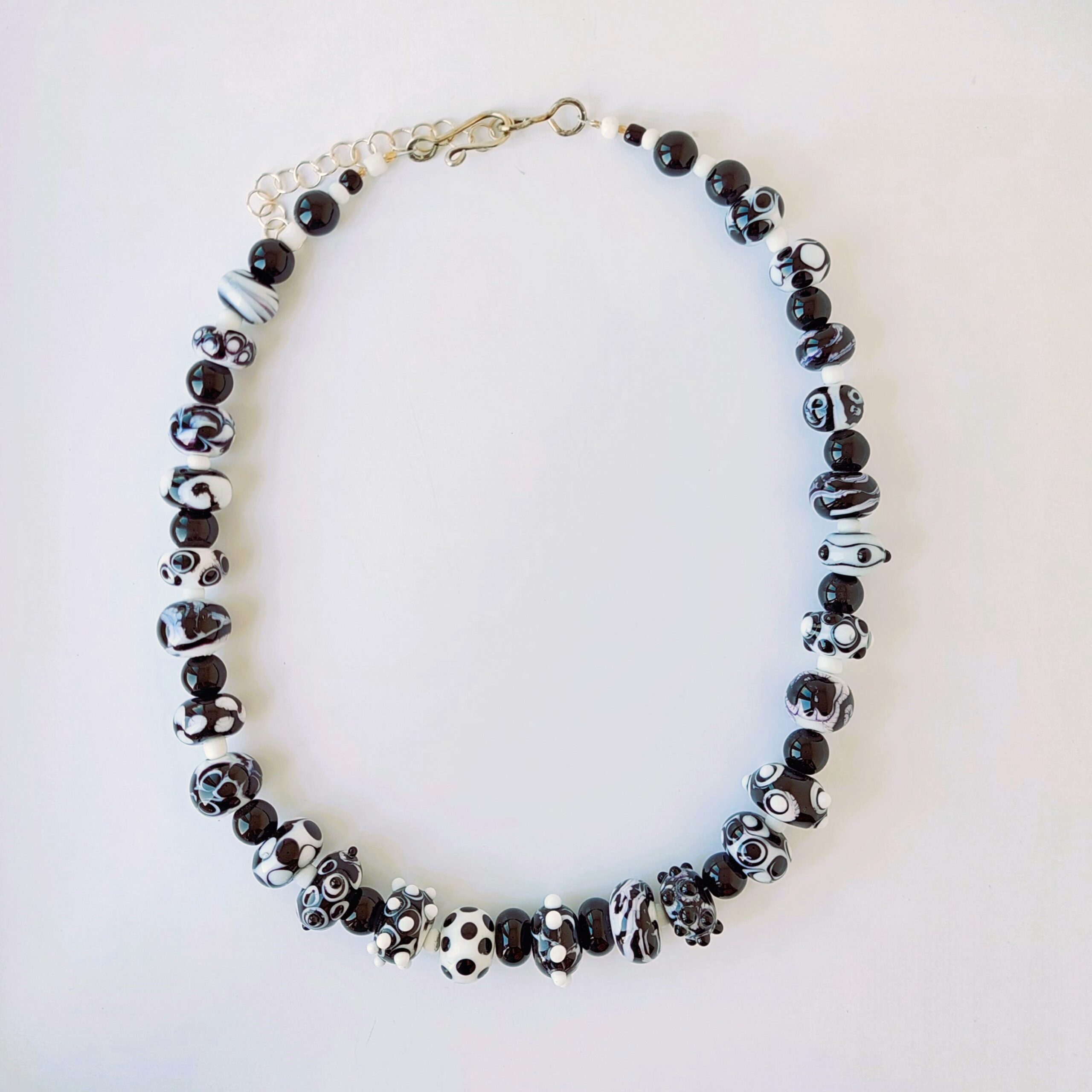 A necklace of handmade glass beads, in black and white. The beads are different from each other, some are decorated with stripes and some with dots or free form patterns. Between the handmade glass beads, there are manufactured black glass beads. The necklace is elegant, with an impressive presence. And also suitable for any outfit and any occasion.