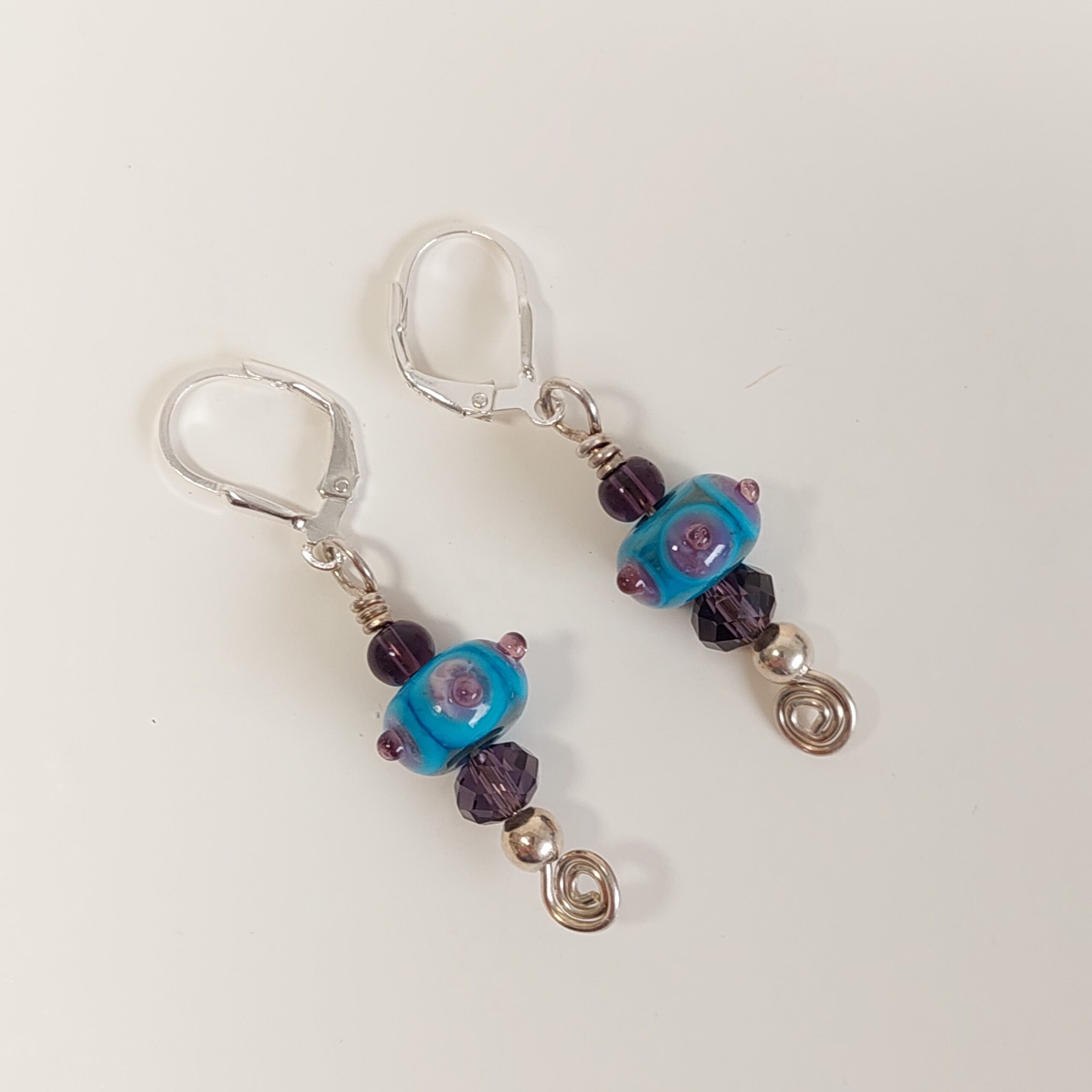 Silver earrings with turquoise glass beads, decorated with three-dimensional purple dots. The earring is on a LEVERBACK ear wire. Each bead, handmade on a torch, is threaded onto a rod that descends from the ear wire and is also decorated with a transparent purple bead and a small silver bead and ends with a small spiral. All parts of the earring are sterling silver.