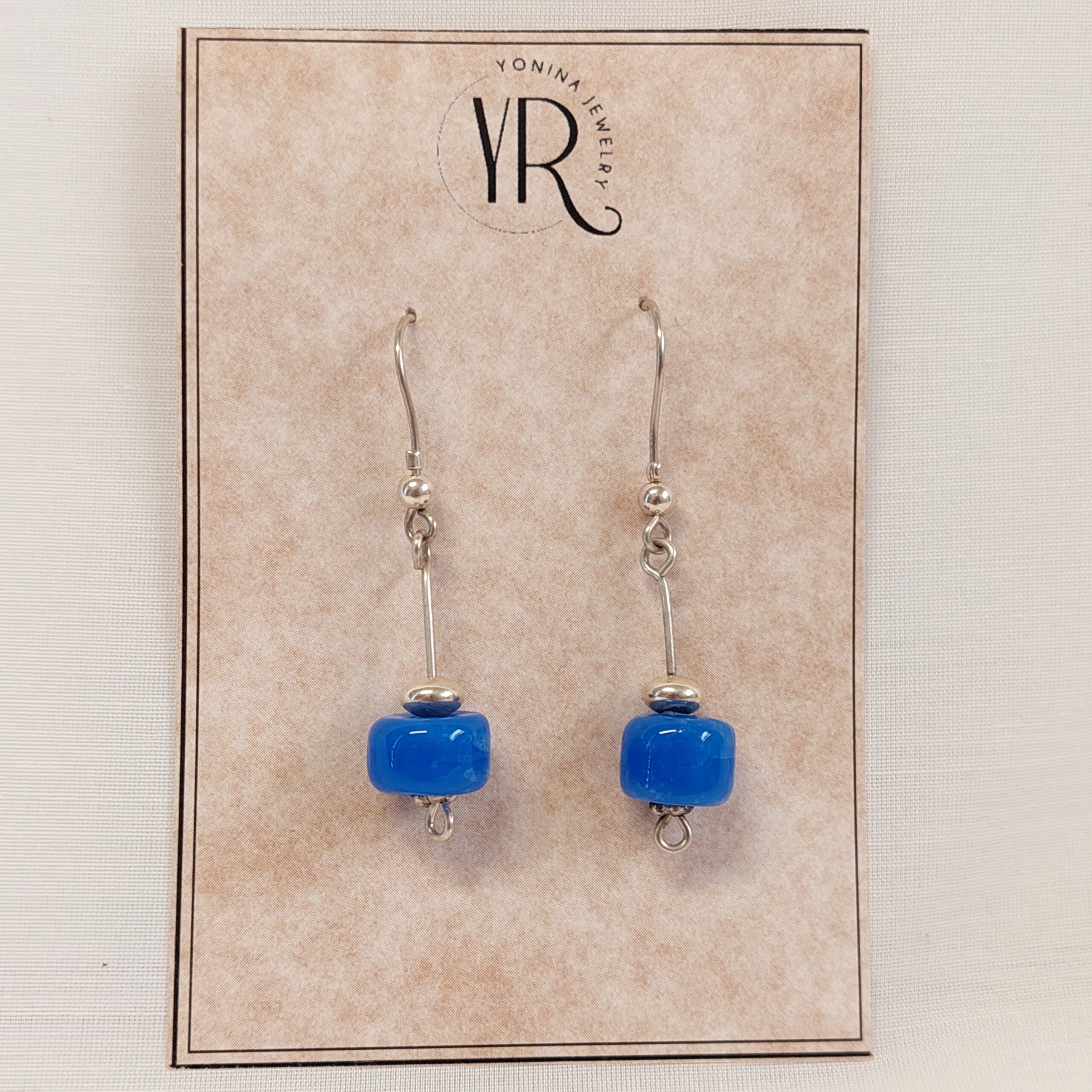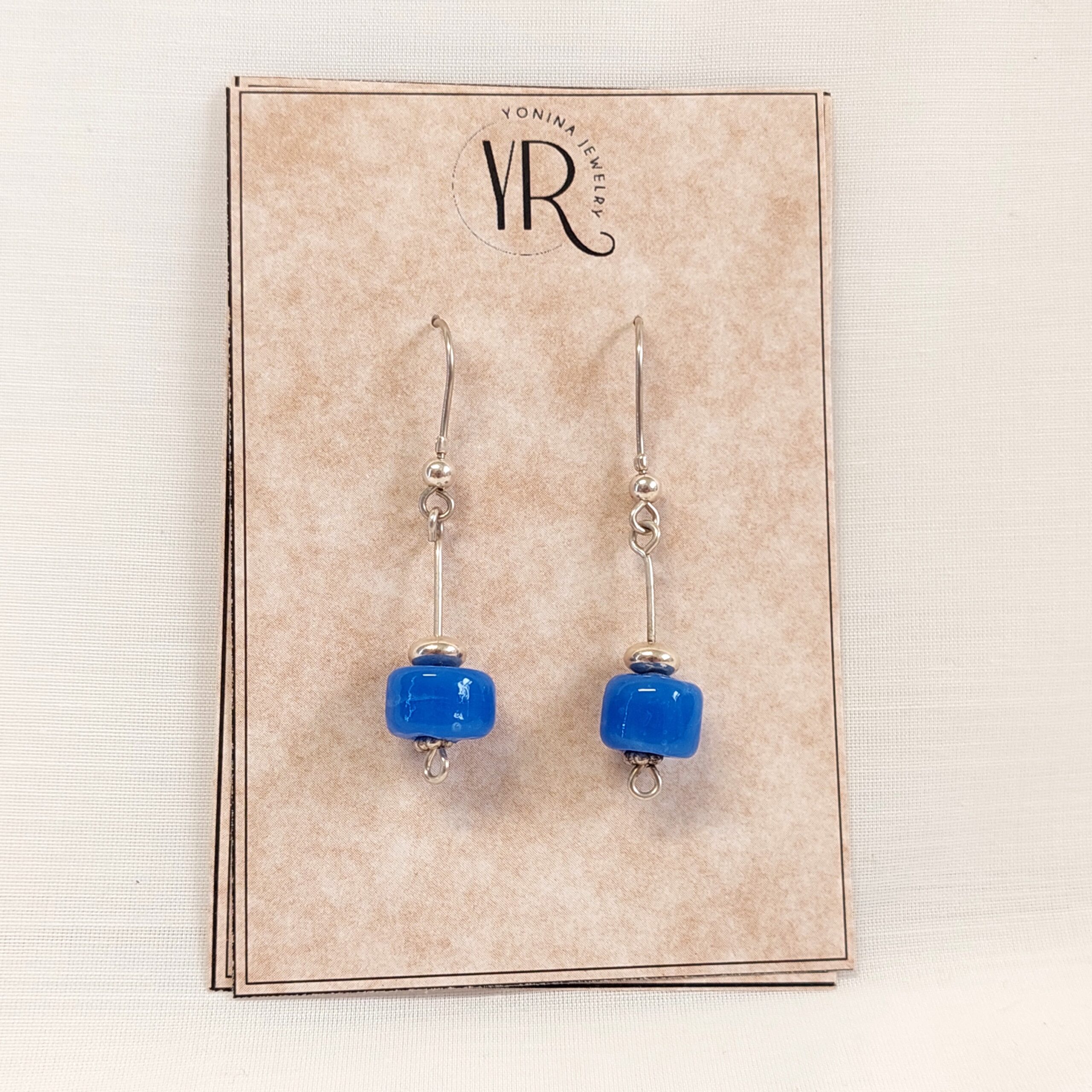 Earrings hang with blue glass beads in the shape of a barrel and silver beads, on a 925 silver rod. The rod hangs from an ear hanger. The entire earring is handmade from 925 silver.