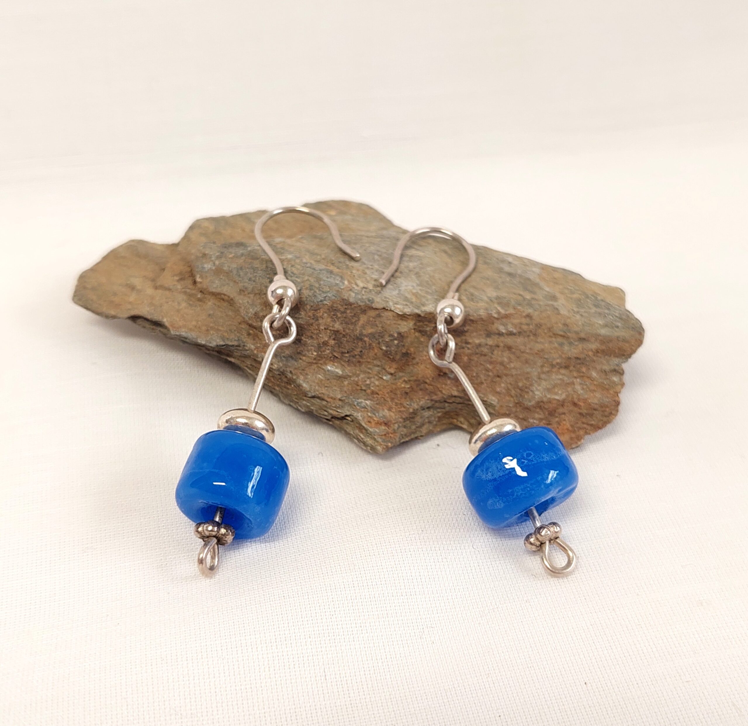 Silver earrings and blue glass beads