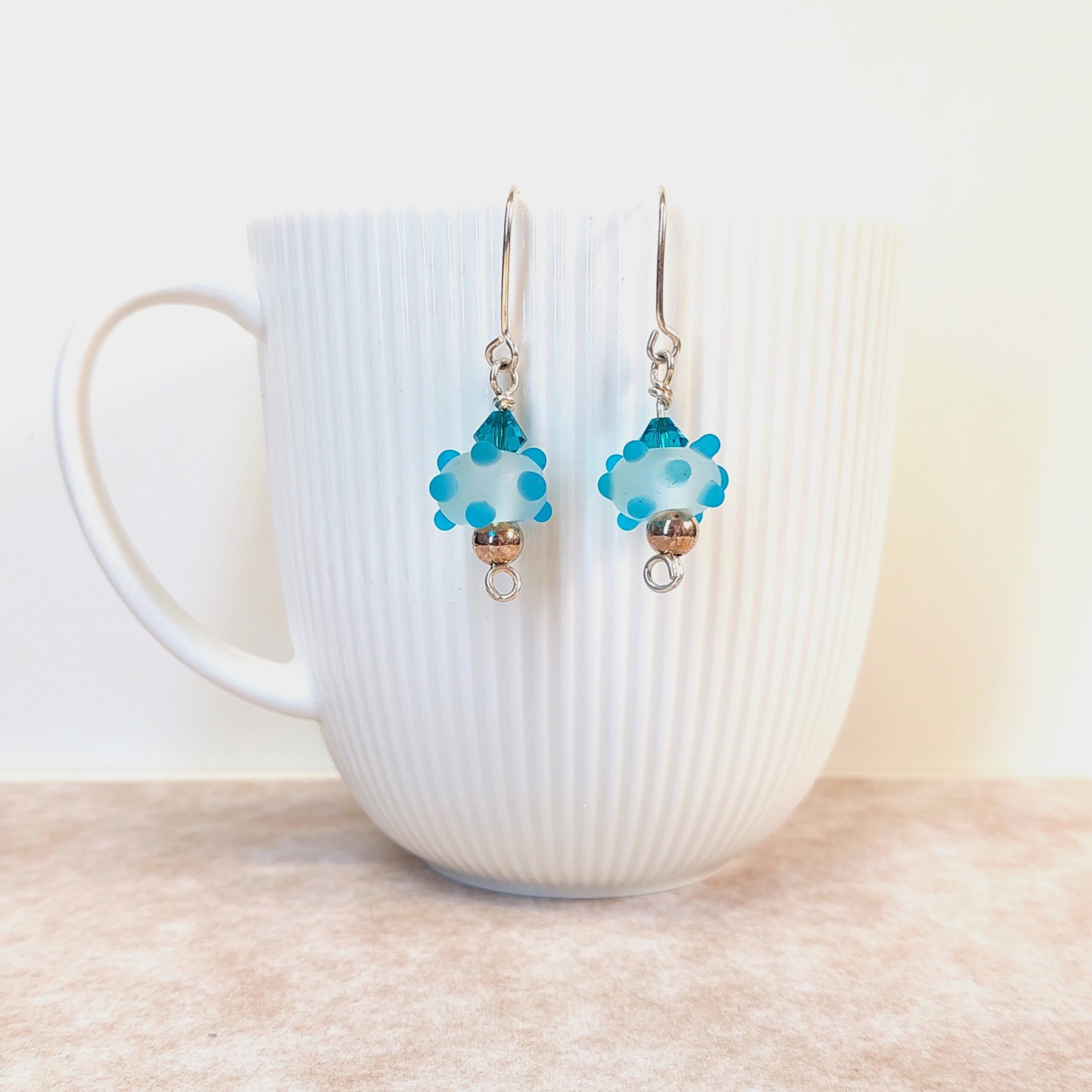 Sterling silver earrings with transparent glass beads decorated with turquoise dots. The beads are handmade, in a transparent matte color and decorated with turquoise dots. There are also turquoise Swarovski beads and small sterling silver balls on the rod. The rod and ear wire are handmade from sterling silver.