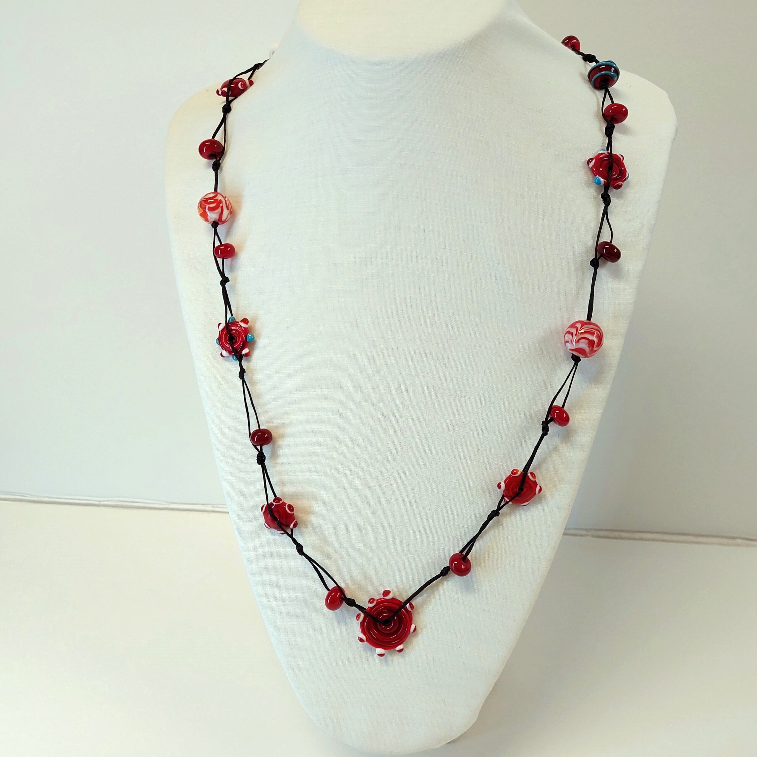 A long necklace made of black wax thread with beads in the shape of discs and round beads in red and white colors and there are touches of turquoise