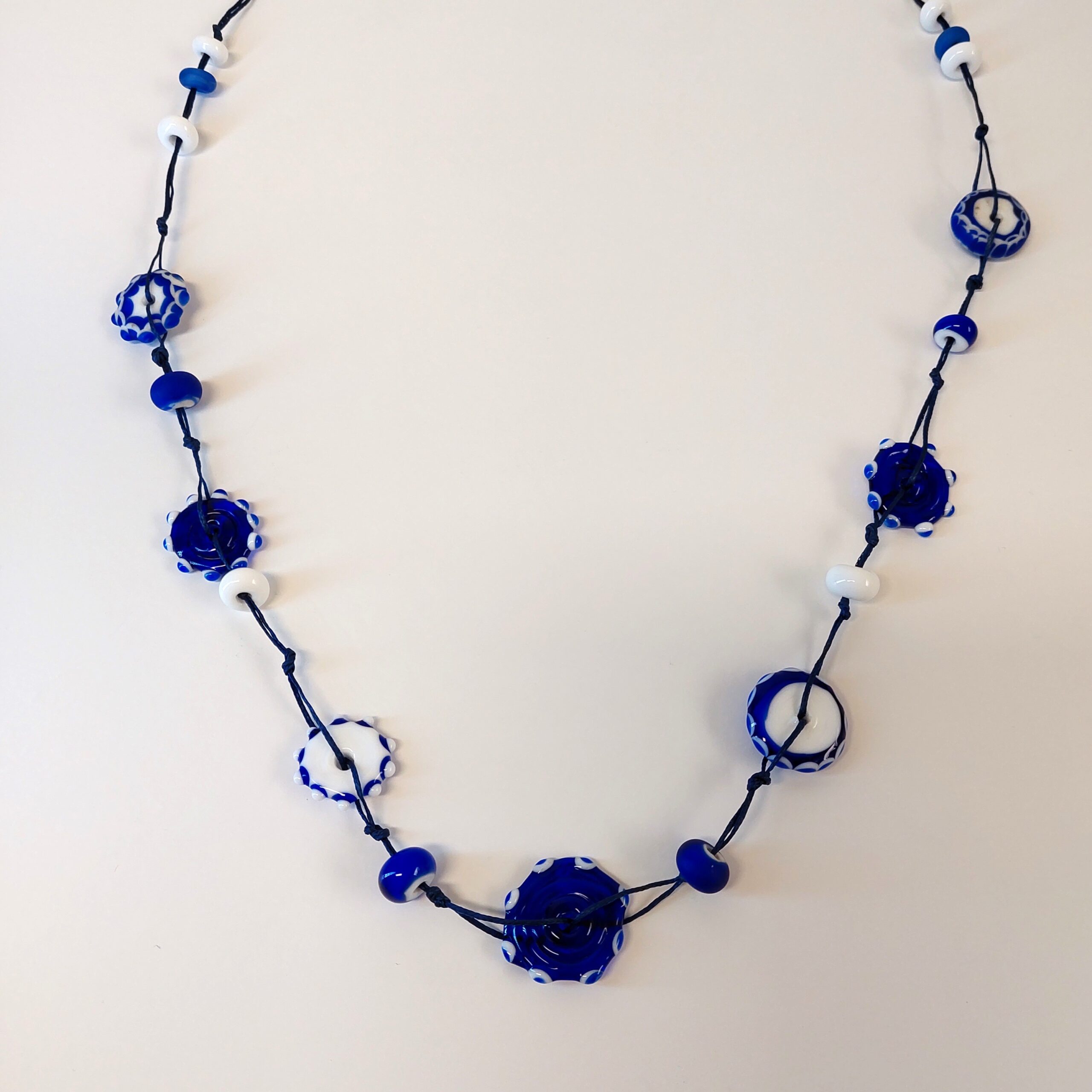 Necklace of wax threads and glass beads in blue and white