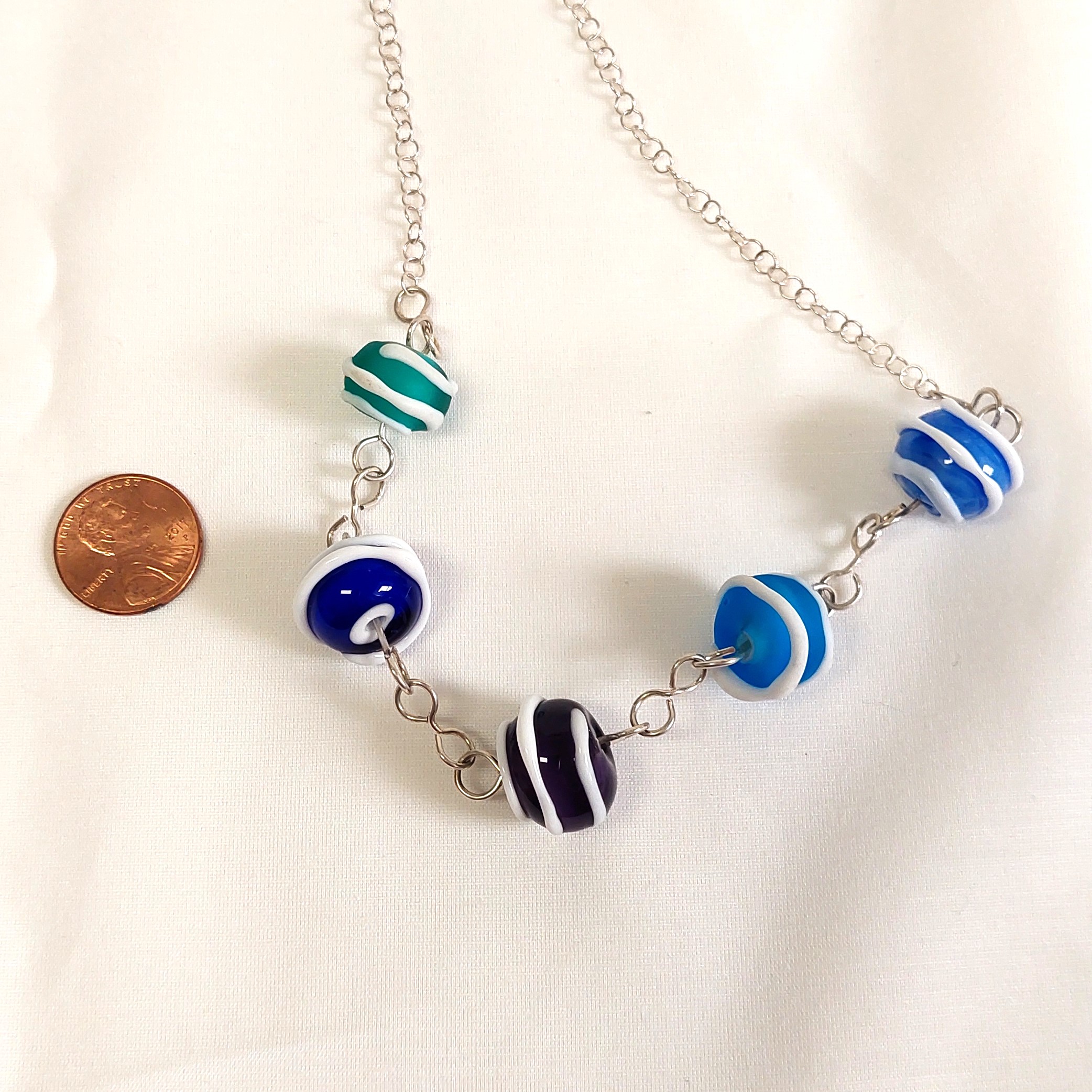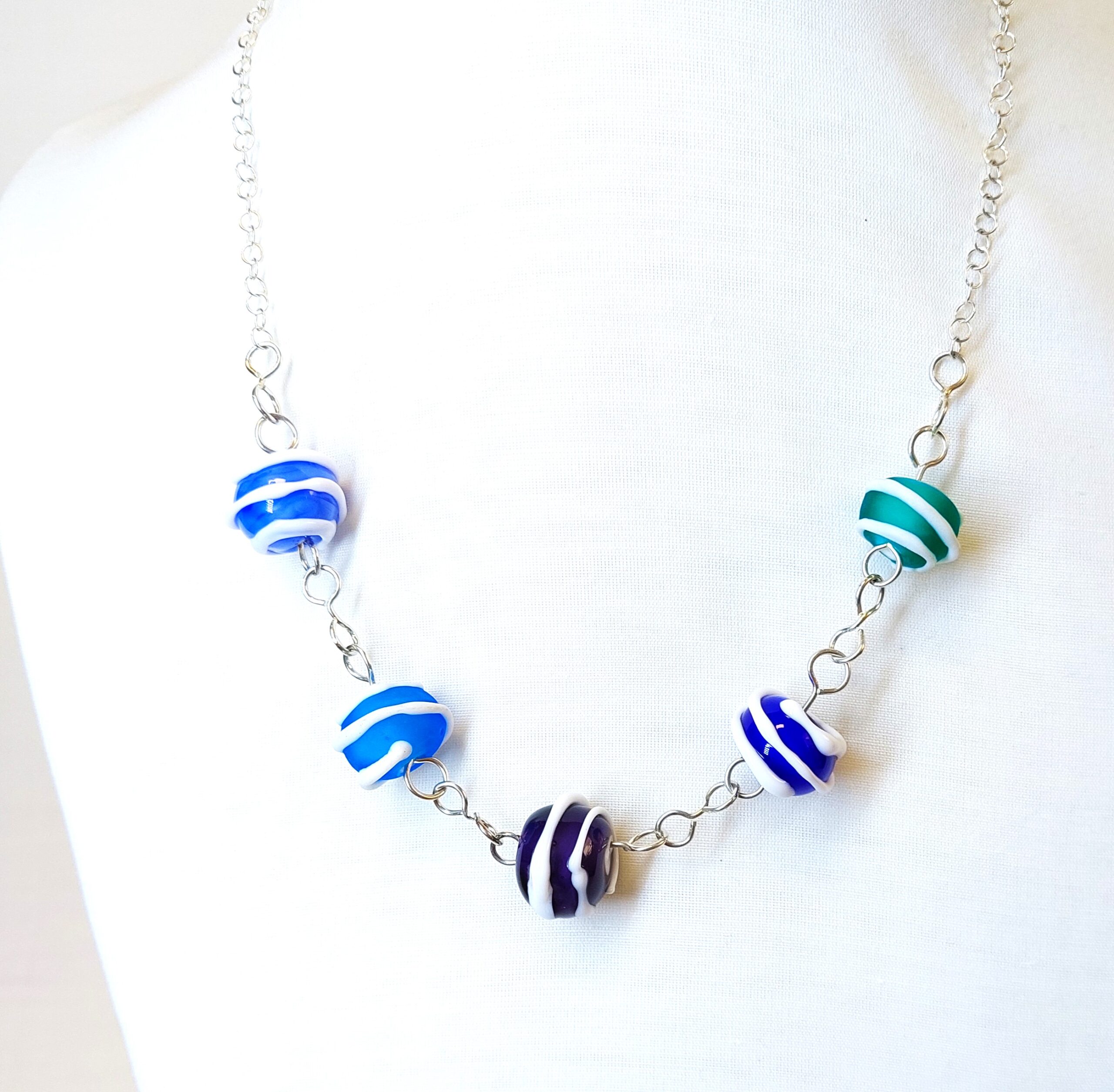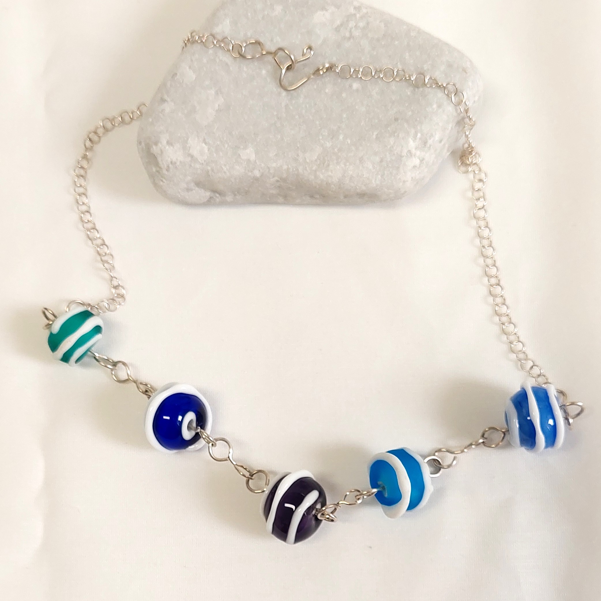 חרוזי זכוכית עבודת יד במבער. 5 חרוזים, ,בצבעים כחול, תכלת, טורקיז ירוק וסגול, מעוטרים בפסים לבנים, על שרשרת חוליות מכסף סטרלינג.  החוליות מחוברות לשרשרת כסף 925 עם סוגר גם כסף 925 עבודת יד בצורת הוק.