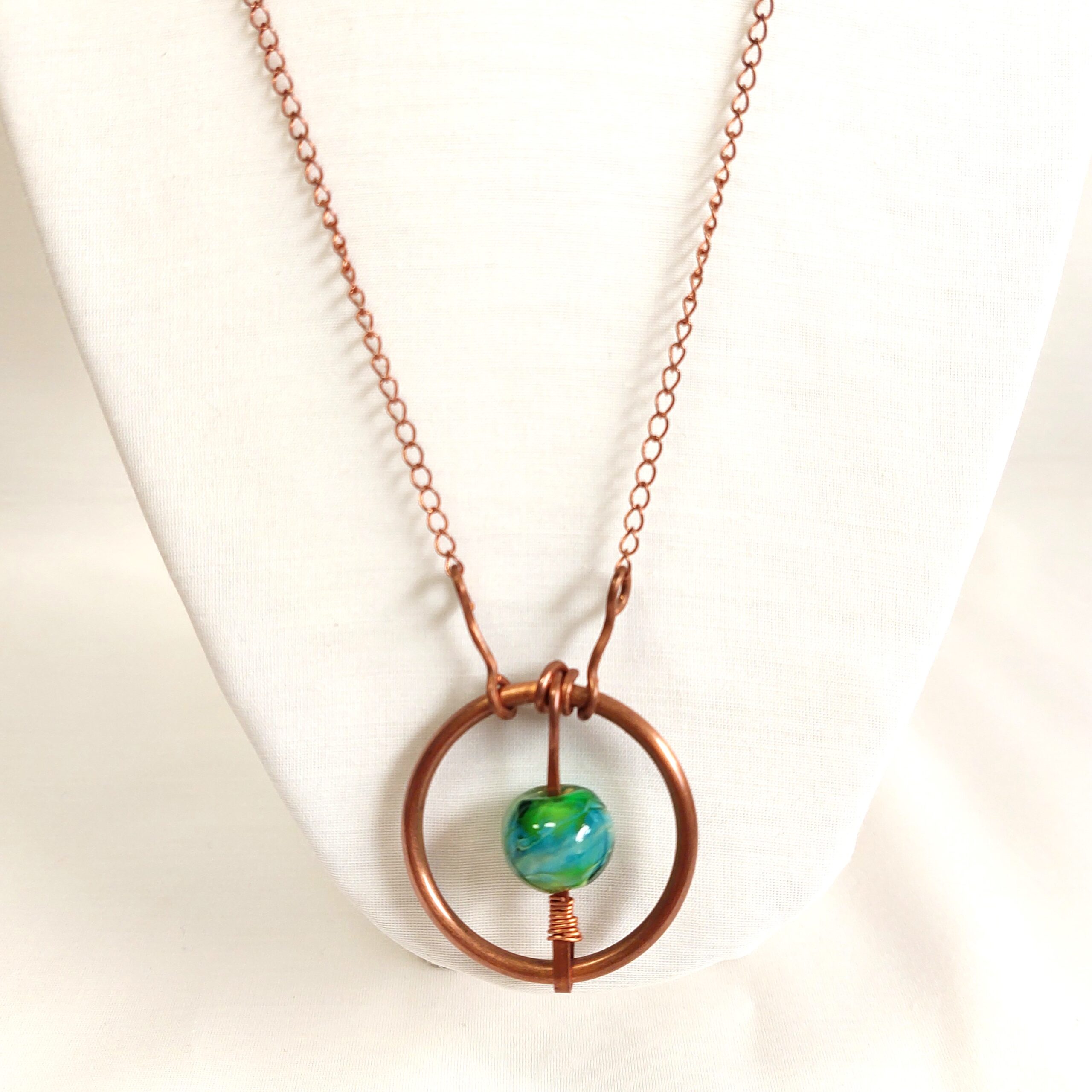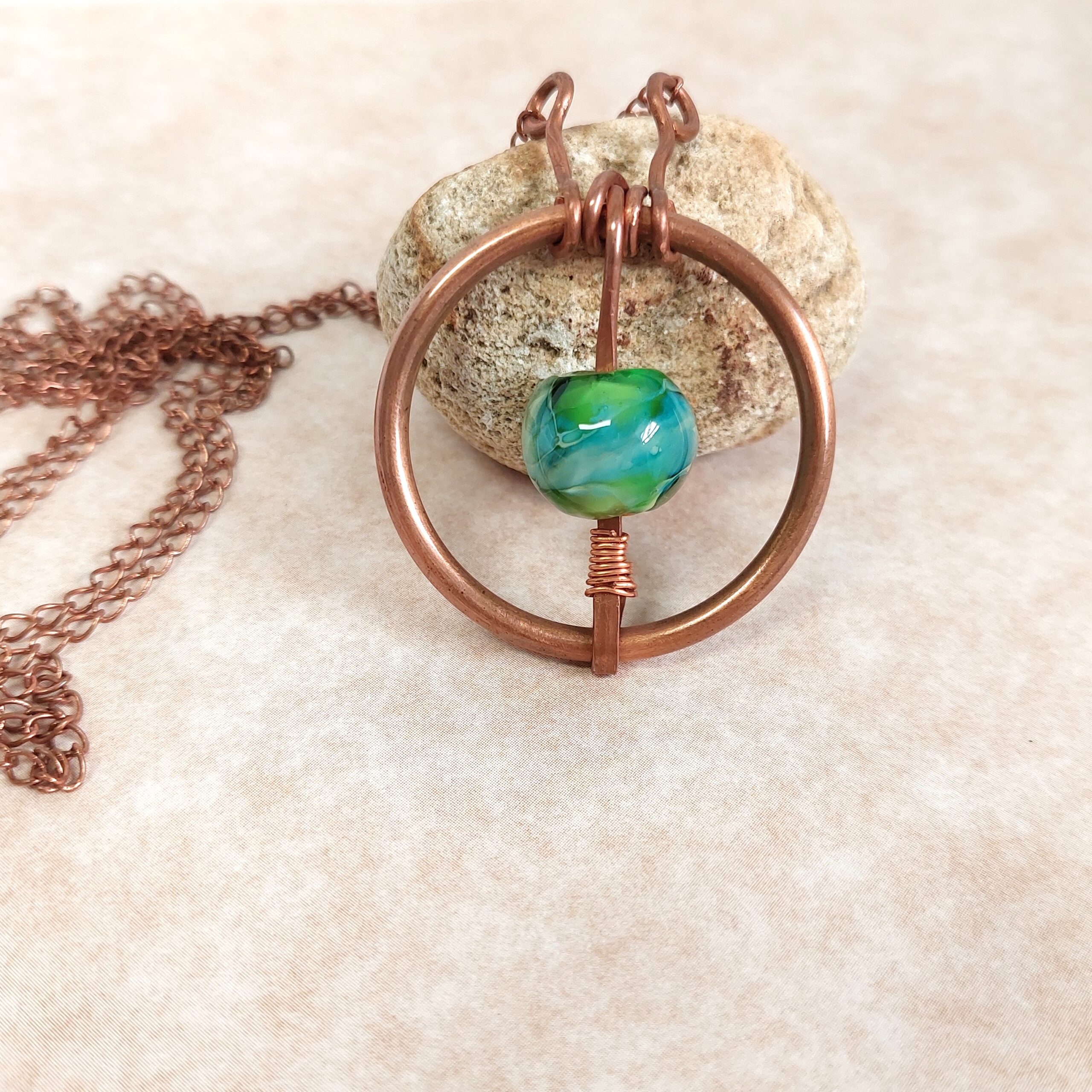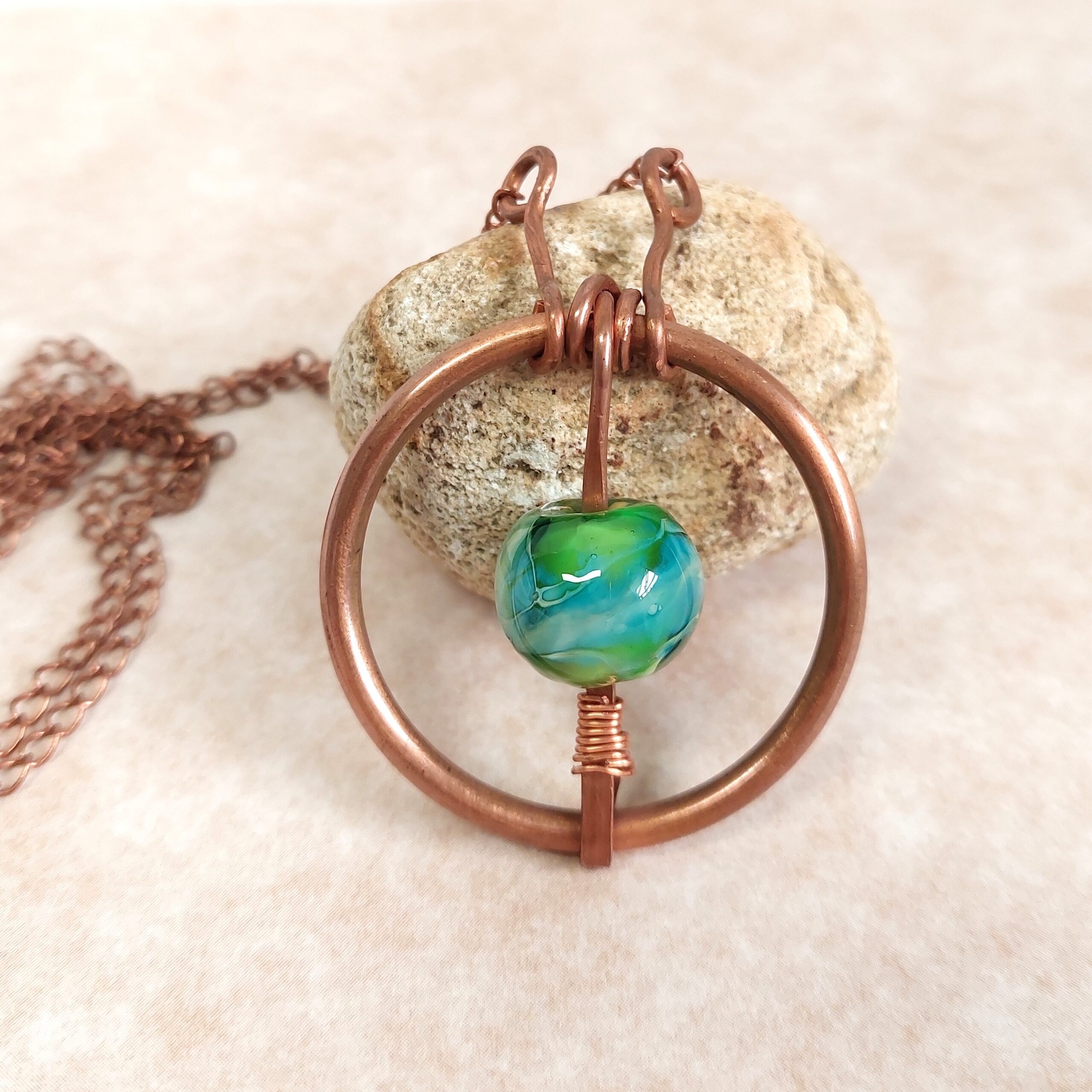 תליון עשוי מעיגול נחושת עבה שבאמצע תלוי חרוז ירוק על שרשרת נחושת ארוכה.