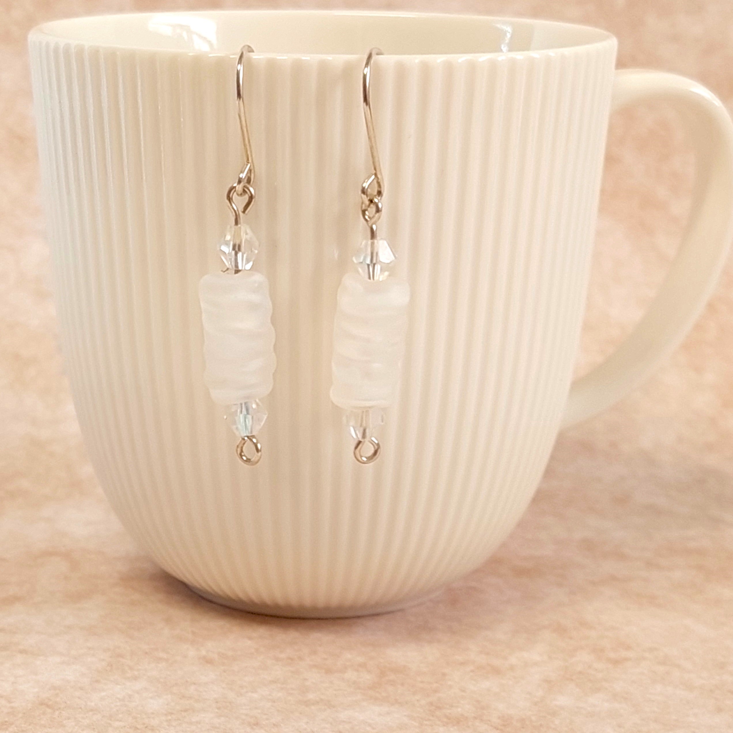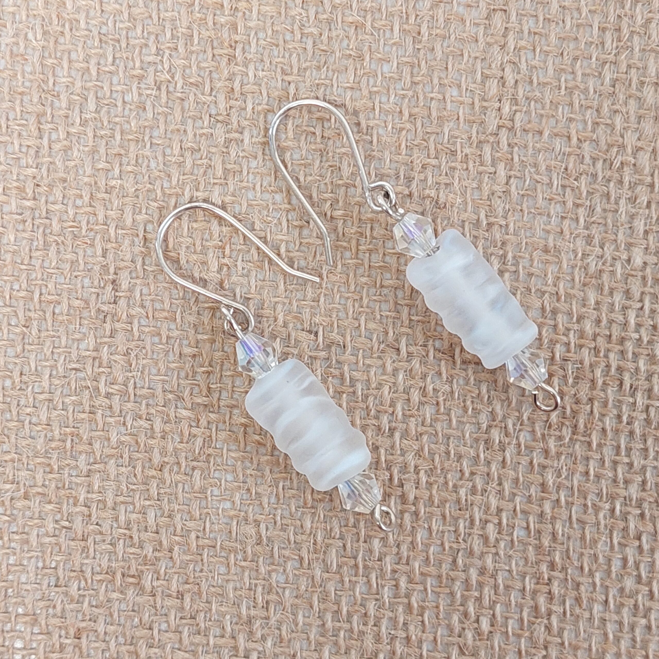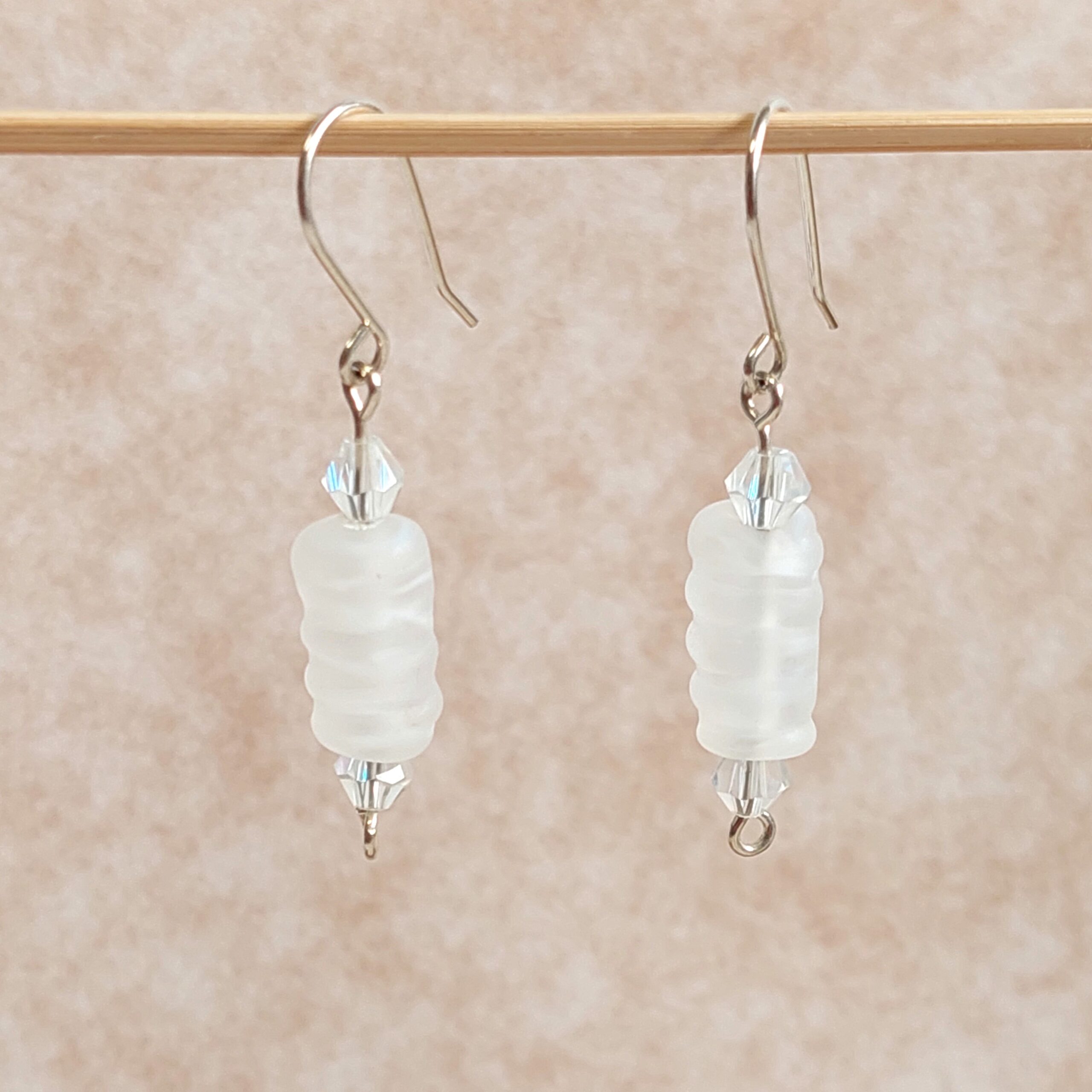 עגילים מכסף עם חרוזי זכוכית בצבע לבן ושקוף מט.
